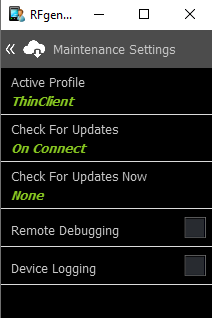 Maintenance Settings is display information a RFgen administrator needs to ensure the client's profile is up-to-date and if needed, debug the client remotely.