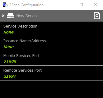 New Service is used to setup a connection to a server, or change the ports for a server, or remove the entire server from the profile. The information here (on the client) should match the server name or IP address described in the source Profile stored in the Mobile Development Studio Profiles folder.