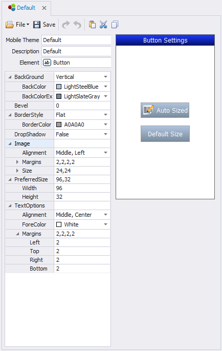 In most cases, the button control's size will be dictated if placed in a Layout control on the form or page. However, if its placed on a Form or Page directly, the Preferred Size is used to set the button width and height. All the other properties are used the same as the other controls.