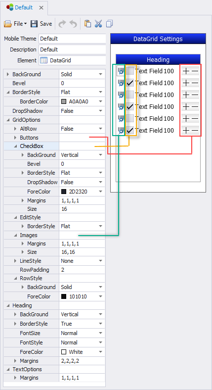 To stylize the checkbox, see the Items: CheckBox property. Note that the CheckBox itself will not display here. CheckBoxes are visible only at runtime. To enable a CheckBox, select it from the Solution Designer > DataGrid >Columns > (Style) list.