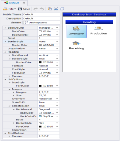 Since the icons are objects contained on a "page," the BackGround, Bevel, BorderStyle and DropShadow properties are used to stylize the page (screen behind the buttons) while the Elements property group is used to arrange the spacing (separation) and look/feel of the tiles.