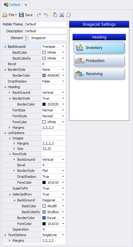 TheImagelist element is used to stylize the look and feel of objects in a list format. The image size dictates the size of the row’s height. The text is also scalable. Horizontal and / or vertical scrollbars can be added but the control supports swiping up and down or left to right. If a title row is not required, it can be turned off.