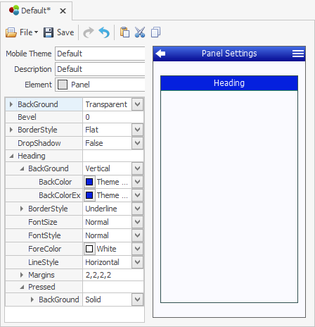 Bevel – sets roundness of the corners of a square or rectangular-shaped object such as a button, panel, tab control, or textbox. “0” will no bevel edges; “2” is the average setting for a rounded corner; “4” is typically used on objects in Android.