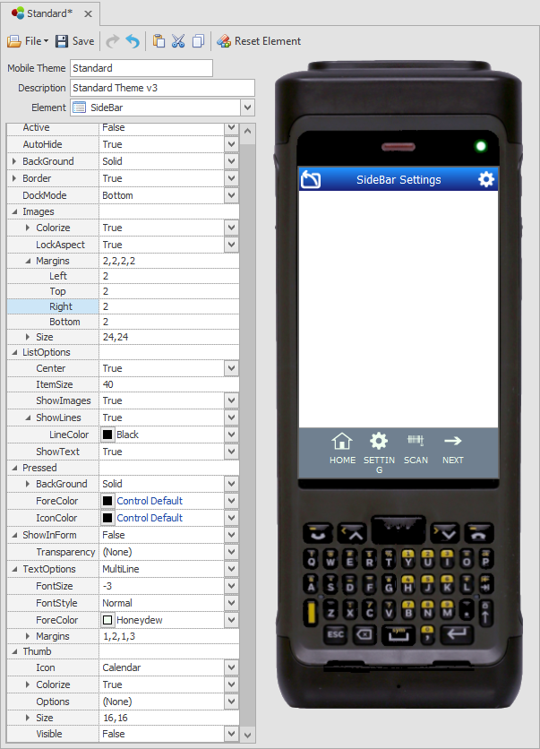 This sets the device SideBar menu appearance and the SideBar Thumb (extended area) appearance. which can be added and customized for your application so the user may have access to additional system functions such as scanning, access to a soft keyboard, mobile profile settings in the client device.