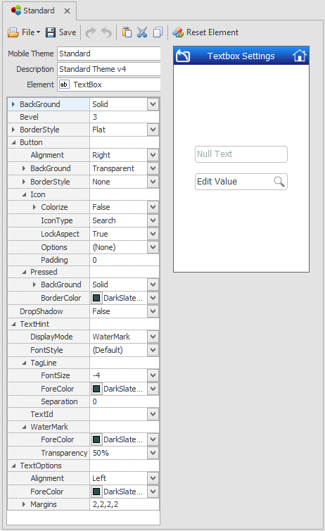 If you are planning to add TextHints to your control, you can stylize how it appears here. TextHints are the words or hints that appear above/below/besides a TextBox or inside a TextBox to help the end user know what to enter into the prompt/TextBox. TextHint >Display Modes are: Both - will display a TagLine and WaterMark; Tagline allows only the Tagline (TextHint Text) to appear outside the textbox; WaterMark only allows the texthint to appear inside the TextBox; and Toggle will go back and forth between an external and internal of text.
