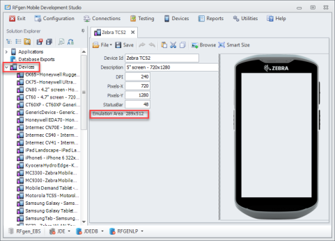 The Devices node is used to store images of a device (handheld reader, tablet, printer, etc.) and set the areas where your application will be displayed so yon can visualize how it will look if you are developing applications. Once a device is added here, its image and information is populated to other areas in Dev Studio.