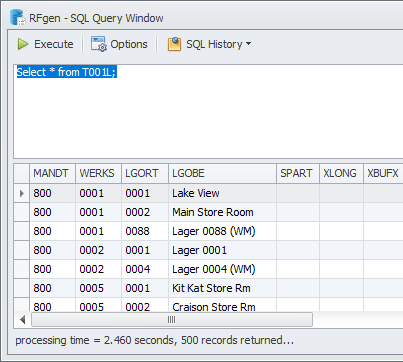 The Execute option tests SQL statements so you can see results before executing the statement in code. The same screen is also used to preserve and recall the statements from SQL History. This utility can also be used to undo updates, check results, delete values or even adding and dropping tables. Any SQL command entered here is submitted to the ODBC driver for execution. There are no limitations by RFgen as to what can be submitted. For more information, see SQL Query Tips below.