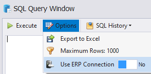 The Options > Use ERP Connection function allows you to enable a connection to a specific ERP which simplifies the process of executing a SQL statement against an ERP connection such as SAP, Oracle JDE, Oracle EBS, Deltek CostPoint, or Microsoft Dynamics. You slide the box over to enable or disable the connection.