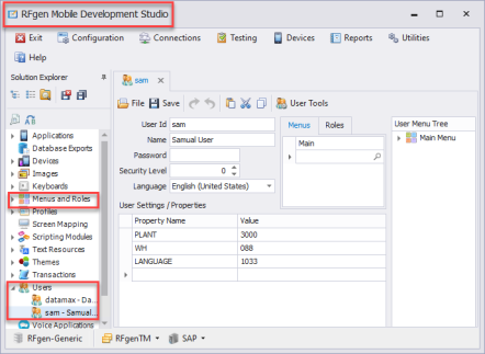 Then the RFgen developer creates in Menu and Roles, a Main Menu that contains all three applications. In the Roles tab he adds the values "Inventory" and "Receiving".